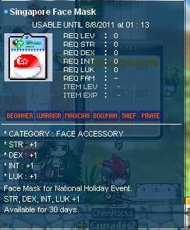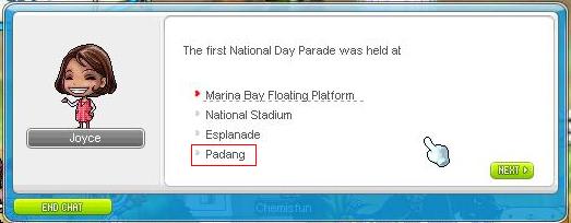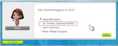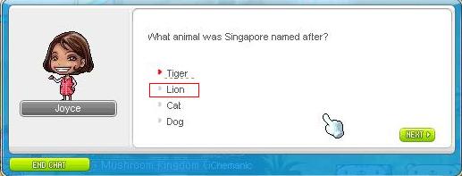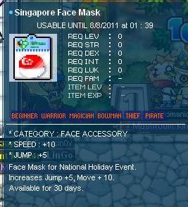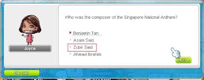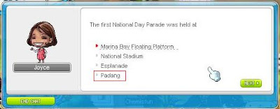 ok... on to the actual event details... as stated, you have to answer 5 qns from Joyce and you will be rewarded with random eq. You will be given 4 choices for the qns, and the questions are REALLY easy. Just for fun i've included the qns and answers for the SG history (sry MY peeps, i'm from SG so... >< but the qns are really easy! i'm sure you wont have a problem with them f3) below. You get to pick at the start whether to take the test on SG or MY history. Correspondingly, the eq you get (although random) will be of the country you picked to do the quiz on. I've gotten 3 face masks so far and they are all of diff stats... lasts 30 days only though. The weapon is entirely random though, so a mage can get a warrior eq which they cant even wear ><... and oh yes, the quest is repeatable once every 6 hours... enjoy and gd luck!